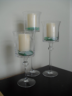 My first change was incorporating a great Willow House product. I love these candle holders but they actually aren't available anymore. I added a few pieces of sea glass that I had leftover from another project for this room that I'm going to share in a bit. I think these are much better proportioned for the room.